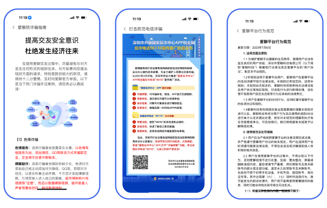 9月9日至15日,正值第十一个国家网络安全宣传周,爱聊积极响应国家号召,以“网络安全为人民,网络安全靠人民”为主题,多渠道开展网络安全宣传,通过即时更新的《爱聊防诈骗指南》《打击防范电信诈骗》《爱聊平台行为规范》等安全交友普及文章的趣味宣传,提升用户的防范意识,持续推动平台整体社交环境向好发展。