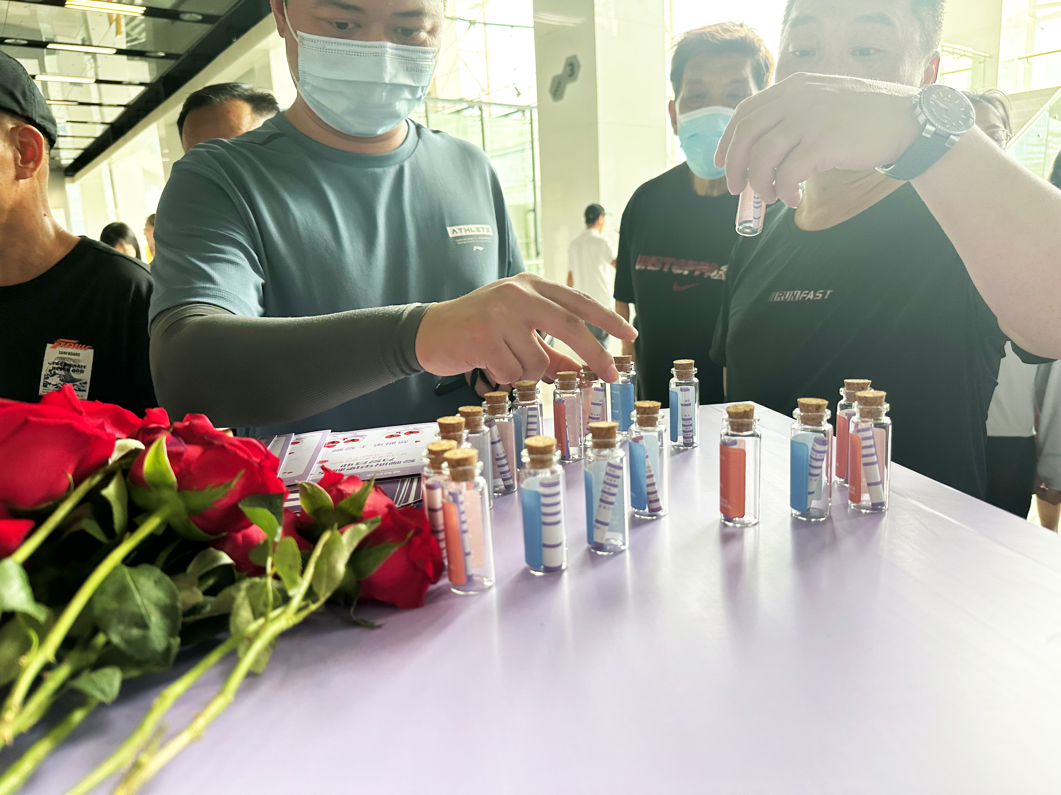 满墙的脱单瓶以月份为分类搭建为超具浪漫色彩的爱心形状,并根据男女性别分为蓝、粉两色,脱单瓶外展示了用户生日、家乡、个性签名等基本信息。来访的人员只需扫码下载爱聊 APP 即可填写信息放入脱单瓶,或从爱心墙中领取中意的脱单瓶,让“爱情转角来相遇,主动就会有故事”的美好憧憬得以实现。